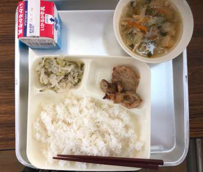 今日の給食の献立は、鶏肉のしょうゆマヨネーズ焼き、五目汁、切り干し大根の柚子の香あえ、ご飯、牛乳でした。鶏肉は下味をつけてジューシーに焼き上げられていました。五目汁にはたくさんの野菜や薄揚げが細かく刻まれていて、だしがよくきいた味わいでした。切り干し大根はきゅうりと和えて、さっぱりとした味つけに柚子の香りがさわやかなおかずで、ご飯によく合う献立でした。