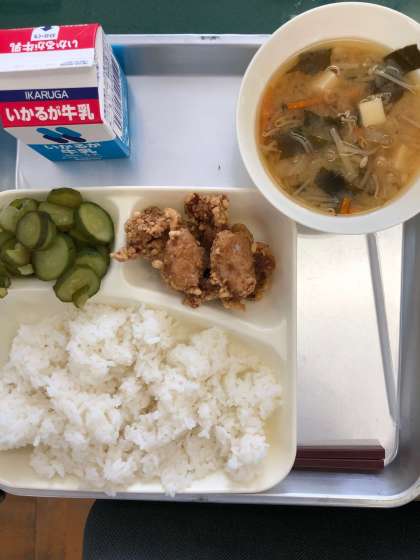 本日の給食献立は、豚肉の香味あげ・みそ汁・きゅうりの甘酢づけ・ごはん・牛乳でした。きゅうりがシャキシャキしていて、でも味もしっかり染み込んでいました。豚肉の香味あげは鳥の唐揚げと勘違いしながら食べてしまうかも!よく噛んでたくさん食べようね。