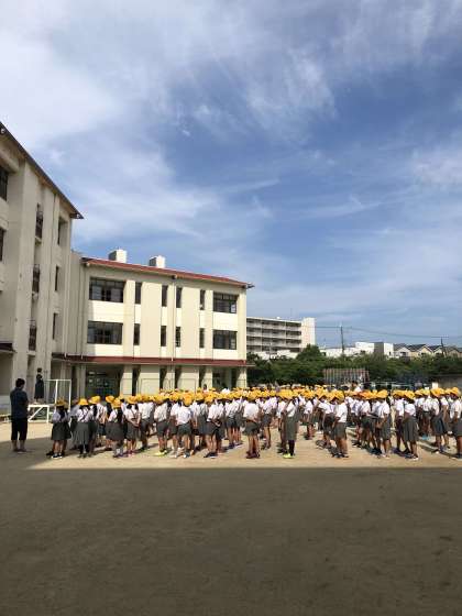1学期最後の児童朝会は、セミの声が鳴り響く中運動場で行われました。