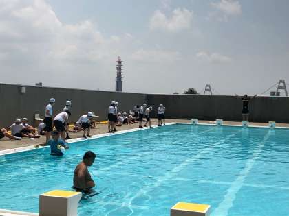 今日は6年生がプールで着衣泳を行いました。服を着て泳ぐのは初めてです。服を着た状態でもしも水に落ちたときに、あわてずに浮かぶことなどを学習しました。