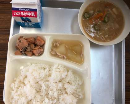 今日の給食の献立は、さけのつけ焼き、味噌汁、とうがんの煮物、ご飯、牛乳でした。さけには下味がしっかりついていて、丁寧に焼かれていました。味噌汁には豆腐やうす揚げの他にたまねぎ、キャベツ、にんじん、オクラなどの野菜がたっぷり入っていました。とうがんの煮物はしょうがをきかせただしの風味がよく、夏らしい献立でした。
