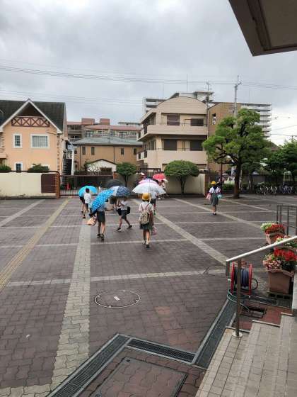 少し雨の降る中、たくさんの荷物を持って、でも足取りも軽く下校しています。