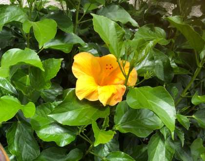 午後から今日は雨ですが、校舎の横に植えられたハイビスカスの花が咲き始めています。鮮やかな黄色の花は、珍しいのではないかと思います。この他に赤やオレンジの花も咲きます。