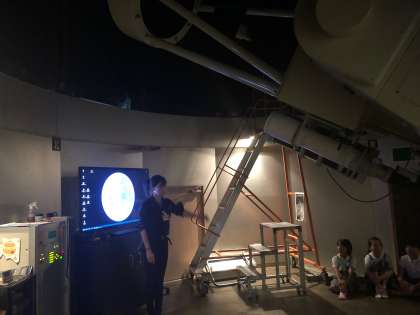 大きな望遠鏡で一人一人太陽の観察をしました。太陽について、大きさや黒点などを映像を見ながら学習しました。もうすぐテラドームを出発します。
