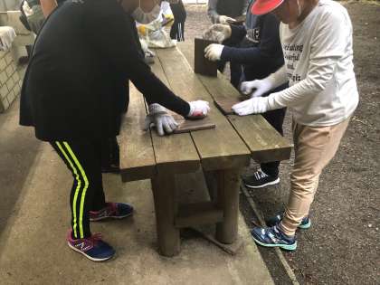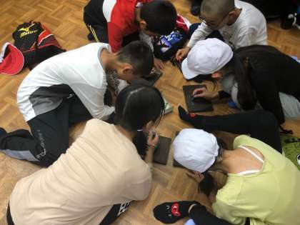 午後の二つ目の行事は、焼き板作りです。焼けた杉の板をたわしや新聞紙で磨いて、宿舎に帰ってから、絵を描いて仕上げます。思い出になる作品ができてきています。