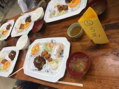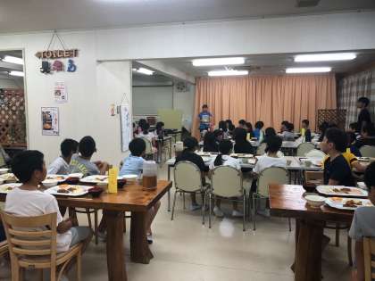 子どもたちは、元気に活動して、お腹もすいて夕食を楽しみにしていました。食事係が配膳をして、早くに準備をすることができました。いただきますをして、どんどん食べておかわりもしています。