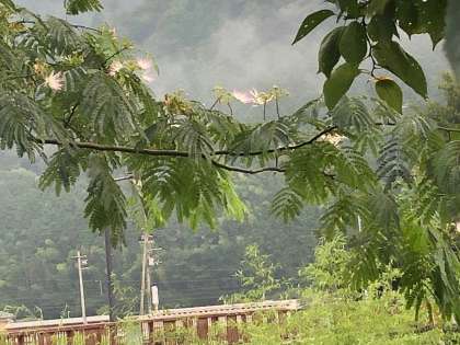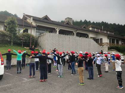 朝は7時からラジオ体操を行いました。全員元気にそろって、指先までピンと伸ばしてラジオ体操で体をほぐしました。