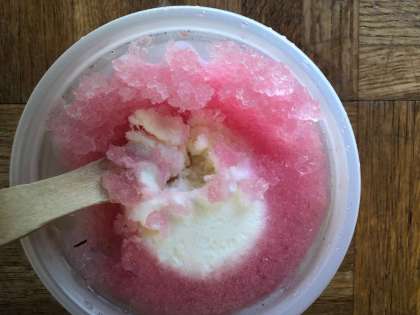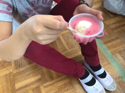 暑い中ですが、外で日陰にいると、涼しい風がときどき吹いてきます。宿舎に戻り、おやつはいちごミルクのアイスです。