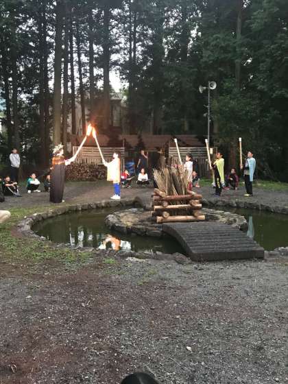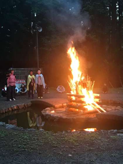 昨日雨でできなかったキャンプファイヤーを開始しました。火の神の入場から、まきに火がつけられて、雰囲気が出てきました。