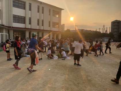 校庭キャンプも後半になりました。カレーが出来上がってきて、運動場にシートを敷いて、みんなでカレーをおいしく食べています。