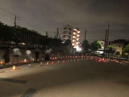 校庭キャンプのキャンプファイヤーが始まりました。みんなで作ったキャンドルの間を通ってファイヤーの周りに班ごとに座っていきます。6年生がまきに火をつけて、楽しい時間が始まります。