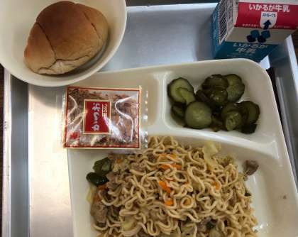 8月27日の給食の献立は、和風焼きそば、きゅうりのゆず風味、パン、牛乳でした。焼きそばにはかつお節をかけて食べます。キャベツや玉ねぎ、にんじん、ピーマンに豚肉が入っていて、あっさりとした味つけで食欲をそそります。きゅうりのゆず風味には酢とゆずの果汁が入っていて焼きそばによくあっていました。2学期最初の献立は、子どもたちに食べやすく作られていました。