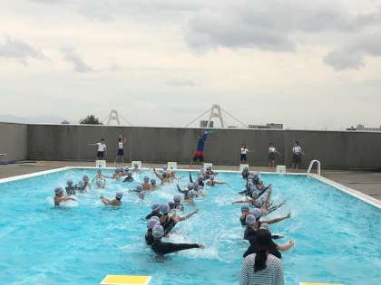 プール水泳もあと少しになりました。4年生がディズニーの体操をしています。動くとだんだん体もあたたまって、水が気持ちよく感じるそうです。