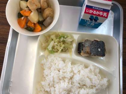今日の給食の献立は、さごしの塩焼き、じゃがいもと一口がんもの煮物、キャベツのおひたし、ごはん、牛乳でした。さごしはあっさりとした塩味で皮はパリッと焼かれていました。じゃがいもと一口がんもの煮物は、鶏肉、つなこんにゃく、たまねぎ、にんじん、三度豆が入っていて、食べごたえがありました。ほくほくしたじゃがいもとしっかり味の染み込んだ一口がんもが、よく合っていました。キャベツのおひたしはあっさりとしていて、ごはんにぴったりの献立でした。