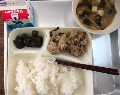 今日の給食の献立は、豚肉の甘辛焼き、みそ汁、オクラのおかか炒めごはん、牛乳でした。豚肉の甘辛焼きはたまねぎとピーマンの野菜の甘さも加わって、しっかりと食べ応えのある味わいでした。みそ汁はだし昆布とけずりぶしを使って丁寧にだしがとられていて、とうふとキャベツ、にんじん、えのき茸、わかめと具だくさんで栄養満点です。オクラには細かなかつお節がまぶされていて、柔らかい歯ごたえに仕上がっていました。
