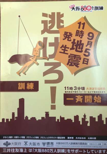 今日9月5日、11時に大阪880万人訓練がありました。11時3分頃に屋外スピーカーから、地震の訓練放送が流されました。校内放送で、児童に机の下などに隠れるよう知らせました。地震などの災害はいつ起こるかわかりません。その時その時で、どう動けばいいのか、普段から話し合っておく必要があります。3学期には、引き渡し訓練も予定しています。