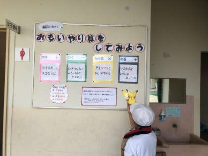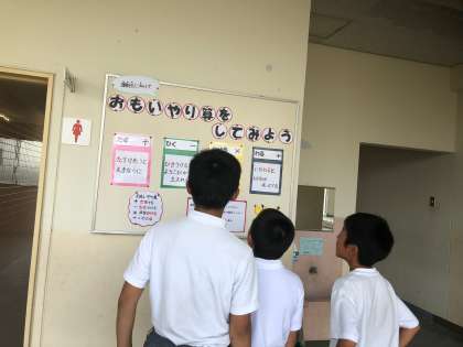 保健室の前の掲示板に「思いやり算をしてみよう」という文字が。なんだろうと子どもたちも見入っています。算数では、?????の四則計算がありますが、「たす」=「助け合う」、「ひく」=「引き受ける」、「かける」=「声をかける」、「わる」=「いたわる」ことで、みんなで協力すして最高の運動会にしようというメッセージです。