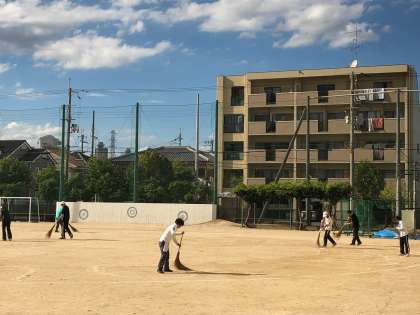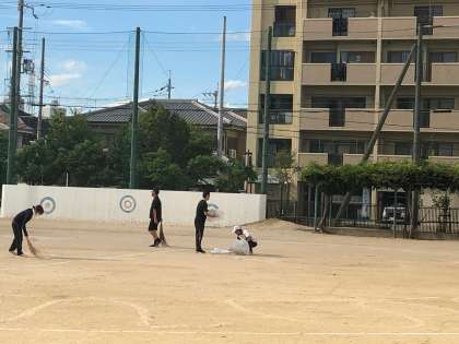 放課後、教職員で運動場ににがりをまきました。みんなで協力して、効率よく作業は進みました。