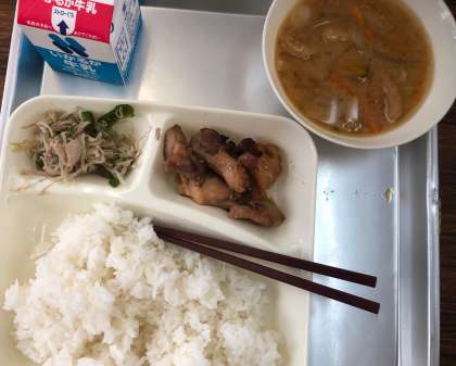今日の給食の献立は、鶏肉の照り焼き、みそ汁、野菜炒め、ご飯、牛乳でした。鶏肉は外は香ばしく、中はジューシーに仕上がっていて、砂糖とみりんと濃口醤油の味付けがご飯に合います。みそ汁には味わい深い薄揚げに、甘いかぼちゃ、たまねぎとにんじん、白ねぎと野菜もたっぷり入っていました。豚肉ともやし、ピーマンの野菜炒めはさっぱりとした味付けでした。