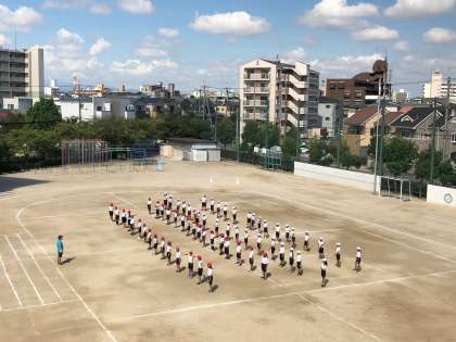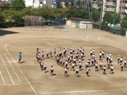 4年生のダンスは隊形を変えるために、運動場での場所の確認が必要です。踊りはみんなマスターしたので、完成が楽しみです。