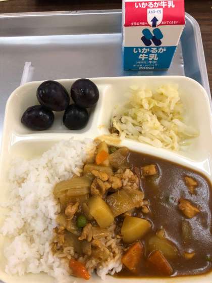 今日の給食の献立は、チキンカレーライス(米粉)、キャベツのピクルス、巨峰(ぶどう)、牛乳でした。チキンカレーの鶏肉は柔らかく、甘い玉ねぎやじゃがいも、人参がゴロゴロ入っていて、食べごたえがあります!キャベツのピクルスは、シャキシャキで甘酸っぱく仕上がっています。巨峰も大粒でした!