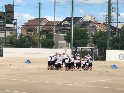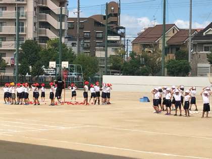 1年生が玉入れの練習をしています。「チェ チェ コリ」の音楽に合わせて踊った後、玉入れをします。カゴは低くしてありますが、なかなか入らないものです。