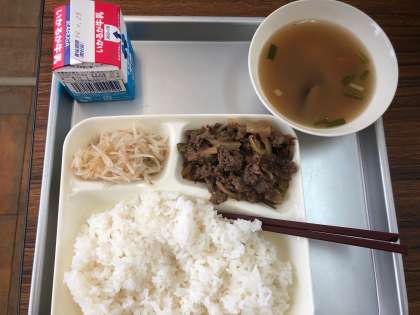 今日の給食の献立は、プルコギ、トック、もやしの甘酢あえ、ご飯、牛乳でした牛肉とたまねぎ、ピーマンを一緒に炒めて、砂糖、醤油、コチュジャンごま油などで味つけされたプルコギはご飯とても合います。トックはあっさりと塩あじにシイタケなどのお出汁がよく出ていました。もやしの甘酢あえはさわやかな酸っぱさで、全体に味の調和のとれた献立でした。