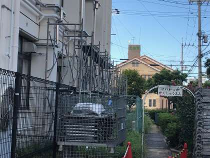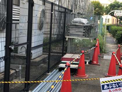 校舎の裏に外壁塗装の足場が組まれています。これからどんどん工事が進みますが、児童の安全には十分配慮してもらっています。