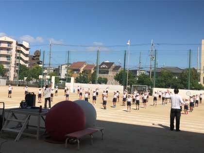 今日は晴天。風も涼しくて、練習にはもってこいの日です。2年生が運動場で大玉ころがしやダンスの練習をしています。力いっぱいがんばっています。