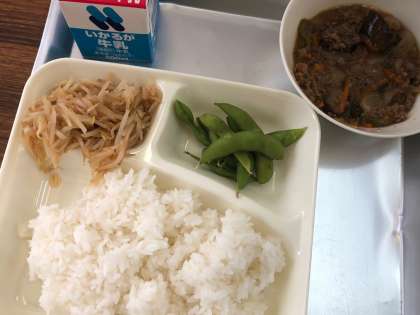 今日の給食の献立は、マーボーなす、もやしのごま酢あえ、えだまめ、ご飯、牛乳でした。たっぷりの牛ひき肉になすがよく合っていて、味噌や豆板醤、しょうがが合わさって食べ応えのあるご飯にぴったりのおかずでした。もやしはしゃきしゃきした歯ごたえを残して、ごま油の香りと酸っぱさが食欲をそそります。えだまめもアクセントになっていて、食べやすい献立でした。