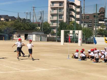 1年生が初めてかけっこの練習をしました。みんな力いっぱい走っていました。