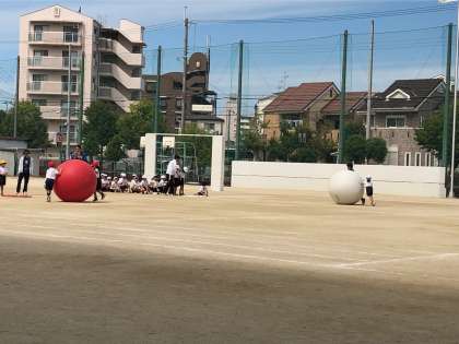 2年生が団体競技の大玉ころがしの練習をしています。とてもいい勝負です。