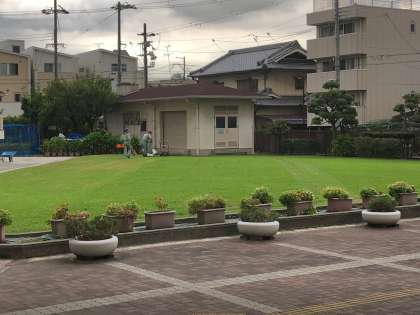 管理作業員さんの手で、玄関の芝生がきれいにかりとられています。