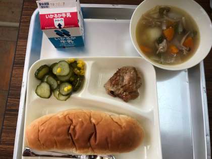 今日の給食の献立は、鶏肉の味噌マリネ焼き(ノンエッグドレッシング)、スープ煮、きゅうりとコーンのサラダ、パン、牛乳でした。鶏肉に八丁味噌、料理酒とノンオイルドレッシングであえたマリネ焼きはさっぱりした酸味とみそのコクがよくあっていました。スープ煮には、じゃがいも、三度豆、たまねぎ、にんじんしめじなどが柔らかく煮込まれていました。野菜の甘さが引き立っていました。きゅうりとコーンのサラダはしゃきしゃきした歯ごたえが残っていて、さっぱりと食べられました。