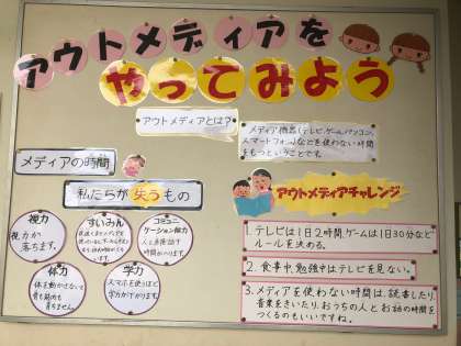 保健室前の掲示が変わりました。10月は、「アウトメディアをやってみよう」がテーマですテレビやゲーム、スマホなどは実はいろいろと体によくない影響を与えています。メディアを使わないで、読書や音楽に親しんだり、家の人とお話をする時間を持つことをおすすめしています。
