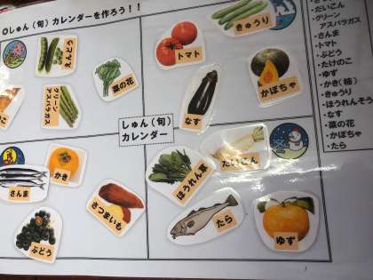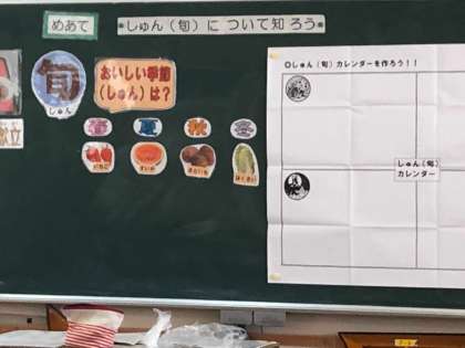 栄養教諭の先生による食育の時間です。しゅん(旬)の食べ物を調べて分類したり、話し合ったりしていました。一年中ある食べ物ですが、秋の味覚を楽しむには、旬のものを知っておくことも大切ですね。