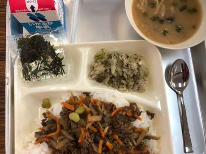 今日の給食の献立は、牛肉のきんぴらちらし、みそ汁、キャベツの赤じそ和え、牛乳でした。甘辛く味付けられた牛肉とごぼう、にんじんのきんぴらに枝豆をご飯にかけて食べると、お寿司の味が食欲をそそります。みそ汁にはしっかりと出汁がとられていて、うすあげにじゃがいも、もやし、しめじなどからも旨みが染み出していて、深い味わいでした。キャベツは細かく切ってあって、シソの香りがして、濃いめの味のちらしとぴったりの献立でした。