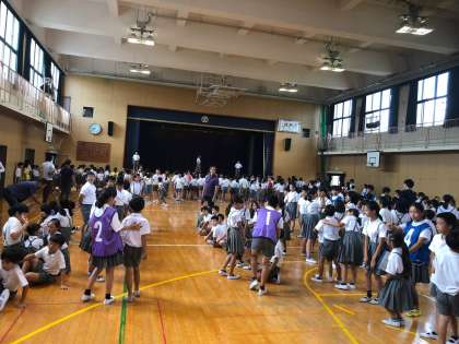 今朝の児童集会はでは、「ならびっこゲーム」をしました。各班で出席番号順や生年月日順に並び替えて、その速さを競います。6年生のリーダーがどううまく並ばせるかが、力の見せ所です。どの班もよく協力して並んでいました。