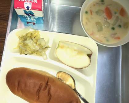 今日の給食の献立は、コーンクリームシチュー(米粉)、白菜のピクルス、りんご、パン、牛乳でした。鶏肉とベーコンのコクと、野菜の甘みがシチューに溶け込んでいて、子どもたちに人気の献立でした。白菜のピクルスは、爽やかな酸味がパンによく合いました。りんごは甘く爽やかな味わいでした。