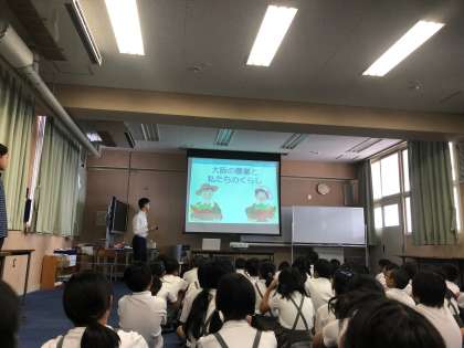 JAから講師の先生に来ていただいて、大阪の農作物やJAの役割などのお話を聞きました。5年生はちょうど社会科で農業について学んでいます。野菜のどこを食べているのかというクイズで盛り上がりました。