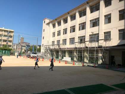 壁面の塗装工事は、運動場側にも足場が組まれてきました。
