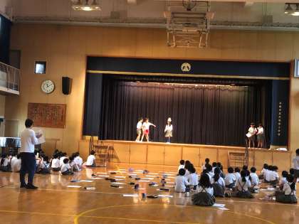 2年生は、学習発表会に向けて、国語科で学習した「名前を見てちょうだい」の劇を講堂の舞台の上で練習していました。大きな講堂で大きな声を出すために、今から舞台を体験しています。後ろまで響く大きな声が出ているグループもあり、これからどんどん上達するのが楽しみです。