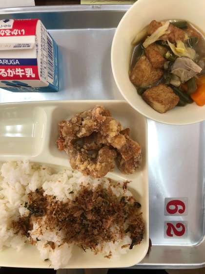今日の給食の献立は、鶏肉のたつたあげ、あつあげと野菜の煮物、おかかなっ葉、ご飯、牛乳でした。おかかなっ葉がふりかけられたご飯はどんどんすすみます。たつたあげも柔らかく揚がっているので、おかわりに並ぶ姿が目に浮かびます。あつあげも野菜も味がしっかり染み込んでいます。