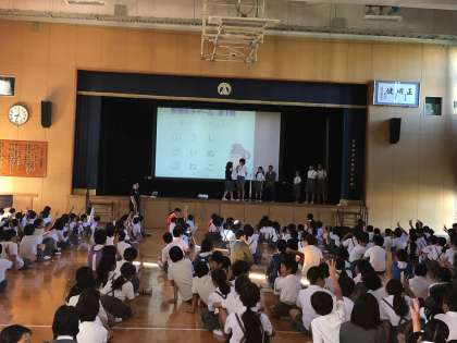 木曜日の児童集会では、「聖徳太子ゲーム」をしました。前にいる集会委員会の人たちが、ばらばらに同時に言った言葉をつなぎ合わせるとどんな言葉になるかを聞き取るゲームです。「問題です」の合図でしっかり聞き取ろうと、講堂の中は、シーンと静まるのが驚きでした。みんな正解しようと真剣に耳をすますことができて、楽しくゲームができました。