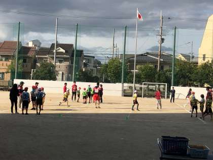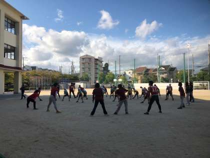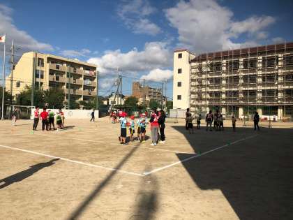 クラブの時間に大阪経済大学のアメリカンフットボール部の学生の人たちに来ていただいて、出前授業をしていただきました。本物の選手の人たちに教えていただく貴重な時間です。子どもたちのは目を輝かせてはりきって運動していました。