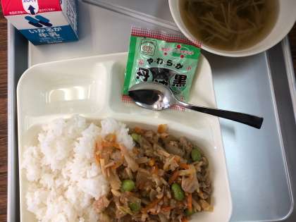 今日の給食の献立は、ピリ辛丼(ご飯)、中華スープ、ソフト黒豆、牛乳でした。ピリ辛丼は豚肉にたまねぎ、白菜、たけのこなどたくさん野菜が入っています。枝豆は緑色でアクセントになっています。トウバンジャンと赤みそがにんにくやしょうがと合わさって、ご飯が進む、少し大人の味わいです。中華スープは、あっさりした味つけで、中華だしのこくがきいていました。ソフト黒豆は、甘過ぎずおいしいデザート感覚で食べられました。