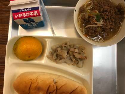 今日の給食の献立は、タンタン麺、レンコンのオイスターソース焼き、みかん、パン、牛乳でした。タンタン麺は、麺とスープを入れた後、上からひき肉をテンメンジャンなどでこってり味つけたものをかけて食べます。スープにひき肉が溶け込んで、いろんな味を楽しめるでした。レンコンのしゃきしゃきした歯ごたえにオイスターソースの味付けがぴったりでした。みかんもほどよい酸味でおいしかったです。特に今日のパンにはきざんださつまいもが入っていて、ふっくらと柔らかく焼き上げられていて、評判がよかったです。