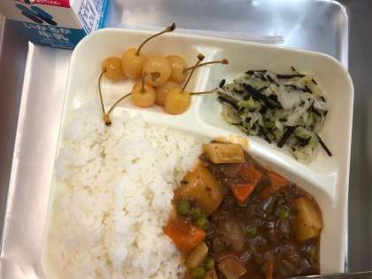 今日の給食の献立は、ハヤシライス[米粉】(ご飯)、キャベツのひじきドレッシング、さくらんぼ(缶)、牛乳でした。上新粉を使ったハヤシライスは、トマトピューレやソース、ローレルがきいていて、野菜も柔らかく、子どもたちに人気でした。キャベツのしゃきしゃき感とひじきの風味のサラダは、あっさりと食べられました。さくらんぼも食べやすく、満足できる献立でした。