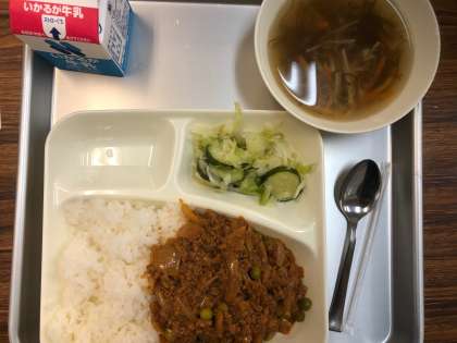 もずくと白ねぎのスープ、キャベツときゅうりのサラダ、牛乳でした。タコライスやもずくのスープは沖縄地方で食べられる献立です。豚肉と牛肉のひき肉と野菜が、トマトピューレやウスターソースなどで濃い目の味つけがされていていて、珍しく、とてもおいしかったです。もずくとねぎのうまみがスープに溶け込んでいて、あっさりとした中にブイヨンの出汁がよくきいていました。キャベツときゅうりはあっさりと食べられました。