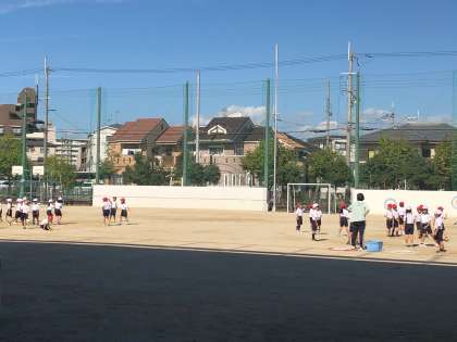 ちょうど保育園の人たちが見学している時、1年生は運動場で転がしドッジボールをしていました。ルールを守って楽しく運動しています。